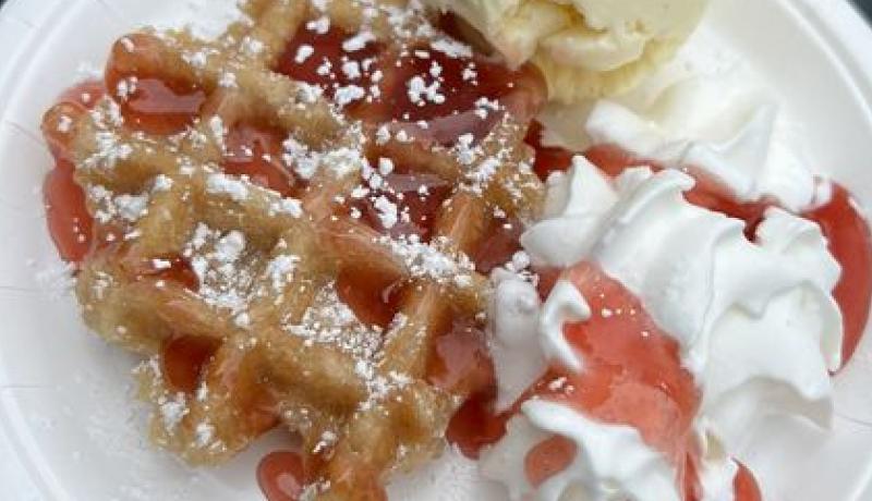 Vohveli, jäätelö, kastike ja kermavaahto. Nam!